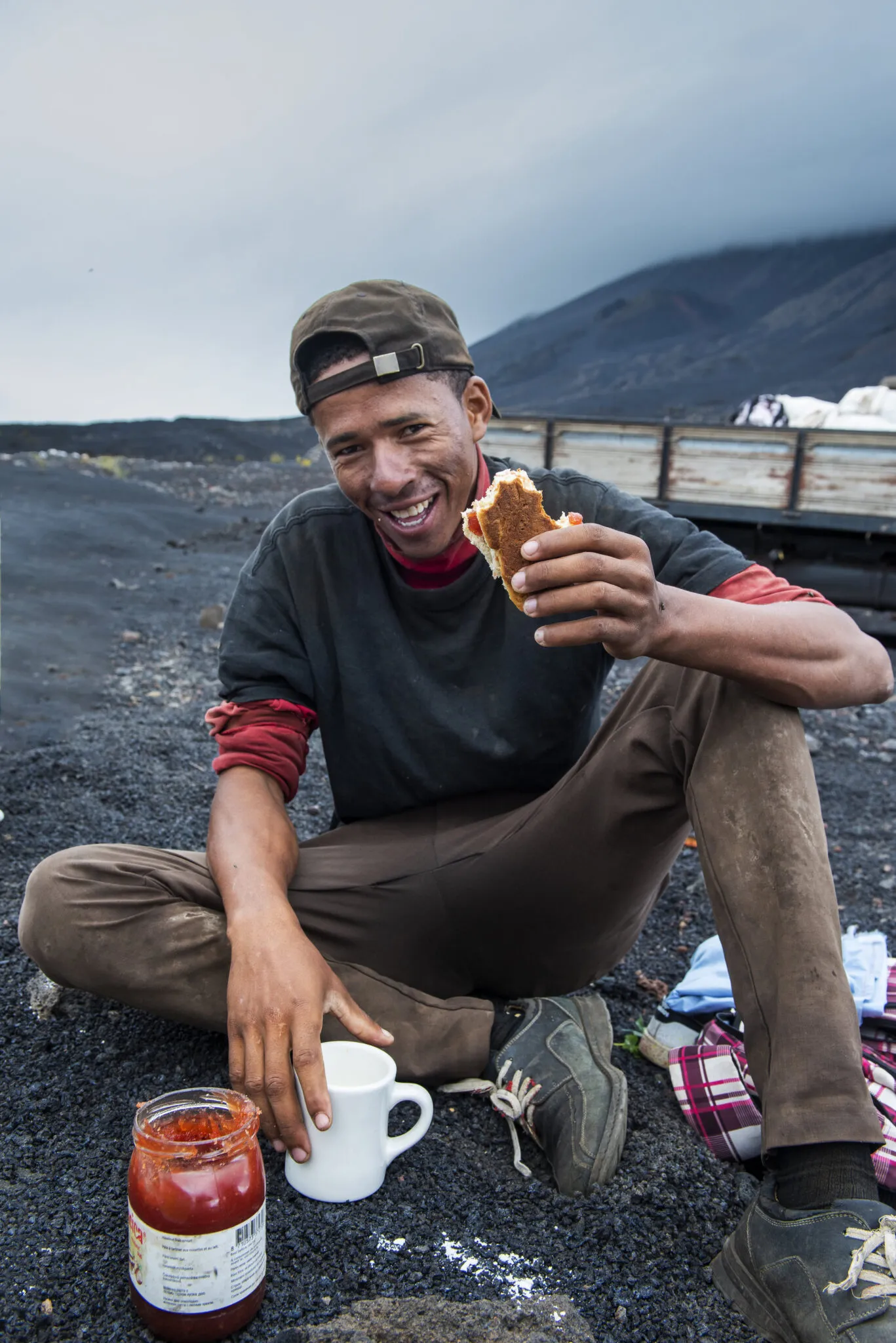 Hoe hoger je komt, hoe droger en ruiger het landschap. En ineens, na een bocht naar links, is daar de Pico do Fogo. Zwartgrijs en imposant torent hij 2890 meter de lucht in, met aan de voet de lavastenen huizen van Chã das Caldeiras. Tijdens de laatste uitbarsting, in 2015, is het dorp nog vrijwel volledig weggevaagd. In de beperkte tijd die ze hadden, hebben de bewoners een evacuatie op touw gezet, maar zodra het veilig was zijn ze teruggekeerd om hun dorp met enorme veerkracht weer op te bouwen. In de wetenschap dat er over gemiddeld zo’n twintig jaar weer een uitbarsting plaatsvindt. Het getuigt van de diepe liefde voor ‘hun’ vulkaan.