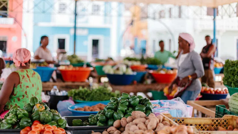 Locals doen boodschappen op de bruisende markt van Praia op het eiland Santiago