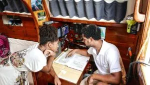 Eenmaal aangemeerd ging een nieuwe wereld voor hem open. Hij werd verliefd op Kaapverdië. En op Katia. Na een jaar samen op de archipel te hebben gewerkt begon het weer te kriebelen: de oceaan riep. Maar deze keer waren de dagen op zee minder eenzaam. Katia ging mee. Samen zeilden ze nog 5 jaar rond de wereld.
