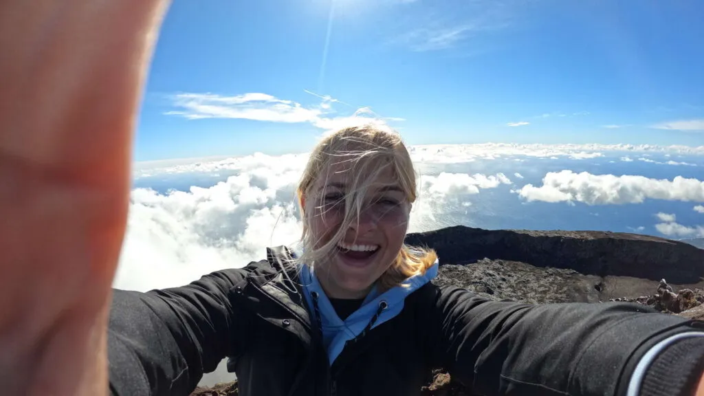 Na 4.5 uur klimmen was het zover. De top was in zicht! Voor een aantal wandelaars is dit het eindpunt. Maar voor degene die écht op het allerhoogste puntje van Portugal willen staan moet je eerst nog de krater in en aan de andere kant weer naar boven naar de Piquinho. Dit kleine piekje van zo’n honderd meter vormt het absolute topje van Mount Pico. Hier sta je op een hoogte van 2.351 meter en voel je je echt even king of the world!