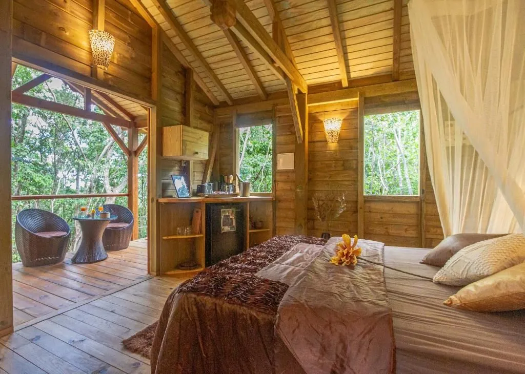 De bungalows zijn afgewerkt met hout en omgeven door een tuin met veel bloemen en tropische planten. Het buitenleven is belangrijk voor Pierre: alle bungalows hebben een buitenlounge en een buiten badkamer. Daarnaast beschikken ze allemaal over een keuken. Bij de lodges heb je echt je eigen plekje. Maar ook voor gezelligheid zit je hier goed: er is er een fijne gemeenschappelijke ruimte en een heerlijk groot zwembad.