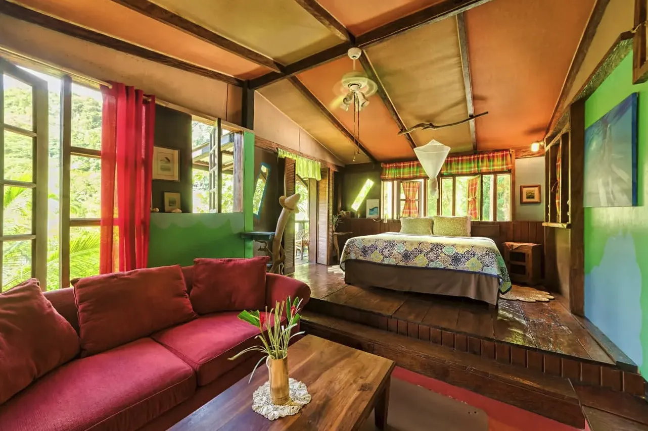 Je verblijft hier in een ruime, kleurrijke kamer met schilderijtjes van lokale kunstenaars en felgekleurde meubels. De inrichting is simpel maar knus. Tegelijkertijd zorgt de open inrichting ervoor dat je je één met de natuur voelt. 's Ochtends geniet je van een vers ontbijt en ook voor een diner met lokaal groenten, kruiden en specerijen, kun je bij de lodge terecht.Wil je wat meer opties? Met een autoritje van tien minuten sta je in het hoofdstadje Roseau.