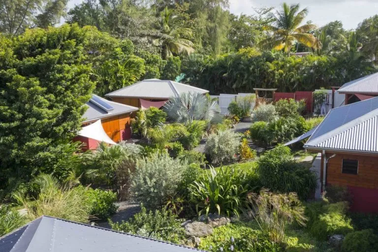 In de tropische tuin van Matthieu vind je 17 totaal verschillende cottages. Ieder huisje heeft zijn eigen stijl. Naast de standaard gîtes met felgekleurde details zijn er creoolse houten hutten, boomhutten en kolibrie cottages met hangmatten. Voor een wat luxer verblijf kun je terecht in de Jungle Lodge. Deze heeft een buitendouche en een privézwembad. Wanneer je in de tuin tussen de prachtige bloemen door wandelt, hoor je het zoemen van de kolibries.