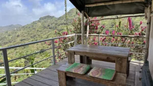 De tenten zijn eenvoudig maar van alle gemakken voorzien, met comfortabele bedden, een klein keukentje, een tafel en stoelen. Het is heerlijk wakker worden met de geluiden van de natuur die ontwaakt: een haan kraait, vogels tsjilpen en een geit mekkert in de buurt. Op het royale terras met picknicktafel en loungebank geniet je met een kop koffie van het waanzinnige uitzicht op de tropische Ribeira-vallei.