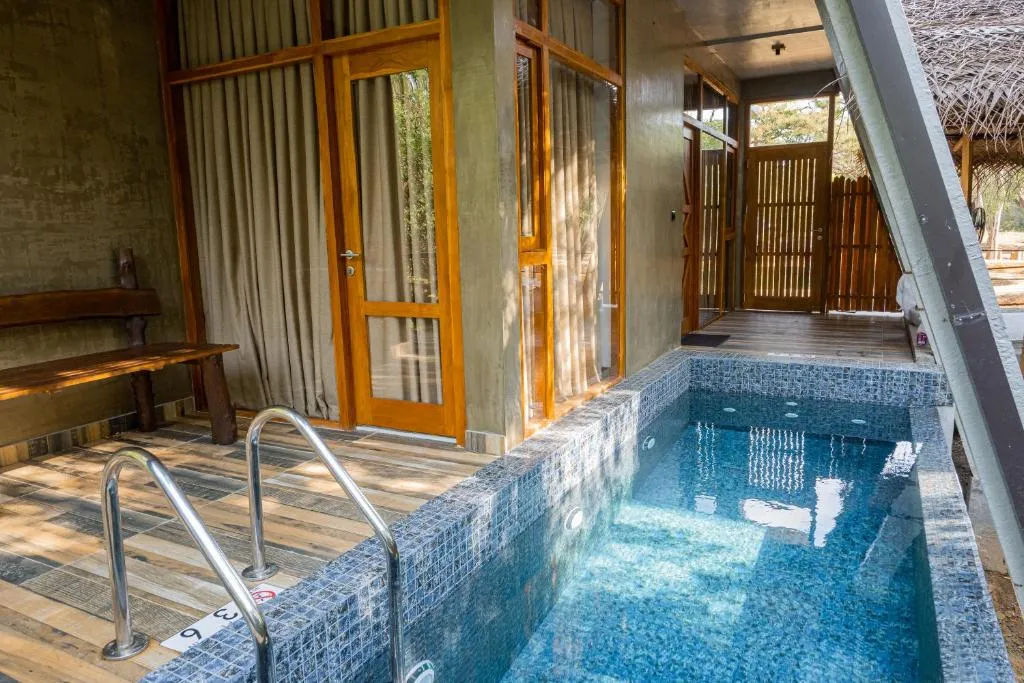 De accommodatie bestaat uit vijf huisjes, elk verdeeld over drie verdiepingen met drie bijzondere kamers. De benedenverdieping heeft een privézwembad en biedt plek aan maximaal drie personen, ideaal voor een intiem verblijf. De middelste kamer beschikt over een balkon met bad, perfect om te ontspannen terwijl je uitkijkt over de omgeving. Op de bovenste verdieping vind je een sfeervolle vide om te slapen, met uitzicht op de weelderige tuin van de cottages en een eigen balkon met bad voor een werkelijk bijzondere ervaring. Na een dag vol avontuur in het wild kun je in het restaurant genieten van heerlijk traditioneel Sri Lankaans eten, vers bereid met lokale ingrediënten.