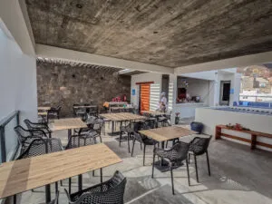 Op het gezellige dakterras van het restaurant, waar de passievruchten boven je hoofd hangen te rijpen, geniet je ’s avonds van zowel Kaapverdische als internationale gerechten. Af en toe nodigt Petra lokale muzikanten uit voor een avond met livemuziek op het dakterras, waarbij ze niet zelden de eerste is die een dansje waagt.
